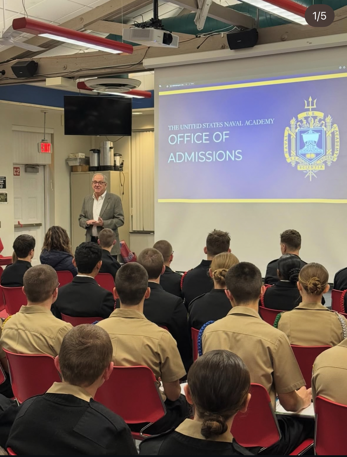 On January 13, MAST’s assigned Blue and Gold Officer, Mr. Peter Engelman, visited the school, gave a presentation, and spoke with interested cadets about the Naval Academy. We had students from all four grade levels attend and were able to ask questions to better their understanding of the Naval Academy and the Opportunities they provide.